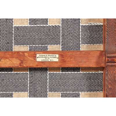 the rectangular padded seat in a shaped seat rail carved with shells, raised on shell carved cabriole legs ending in trifid feet, bearing an ivorine trade label 'Designed & Executed by Bartholomew & Fletcher/ Est. 1843/ LONDON W.1'