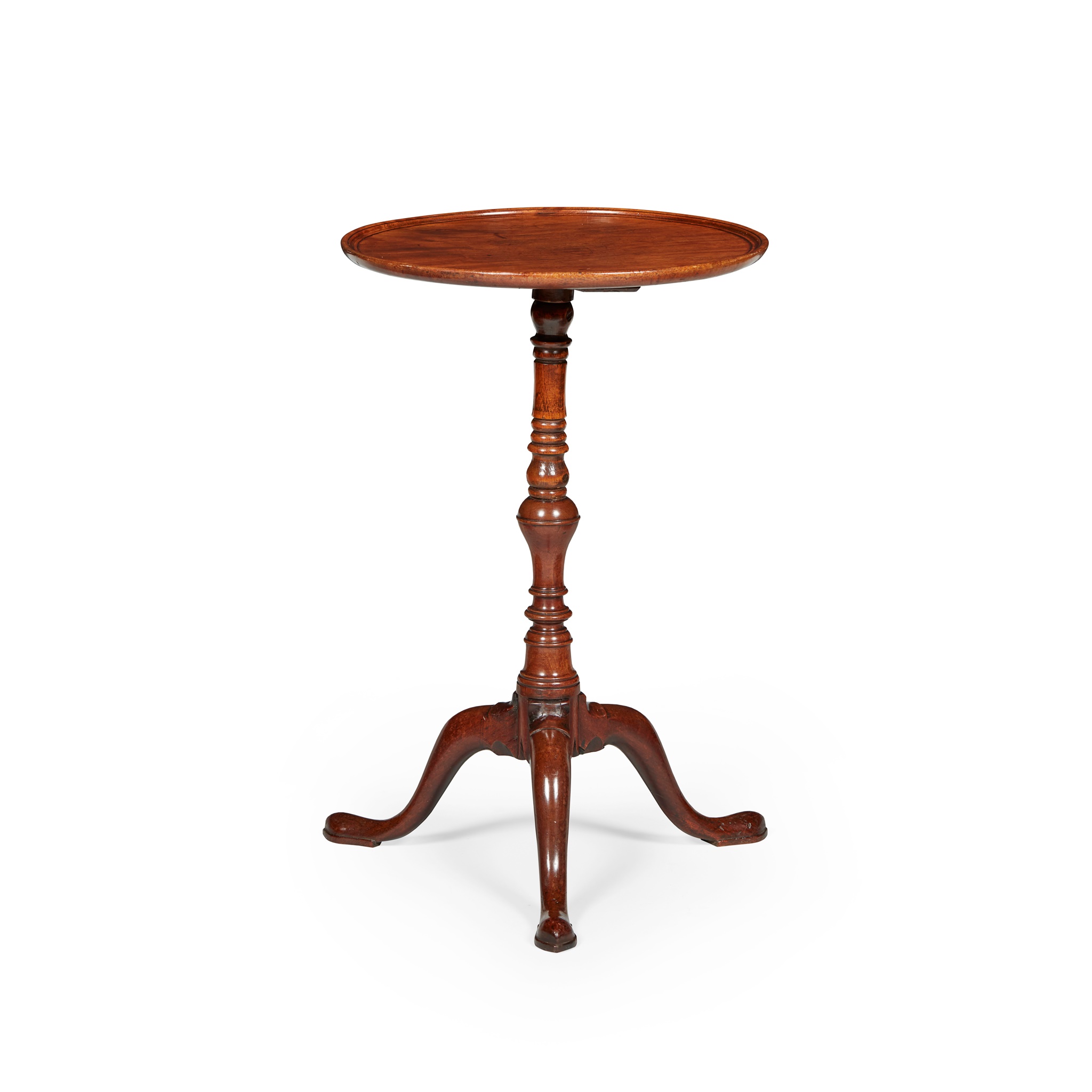 the circular dished top on a turned baluster support and tripod base ending in pointed pad feet