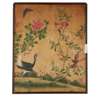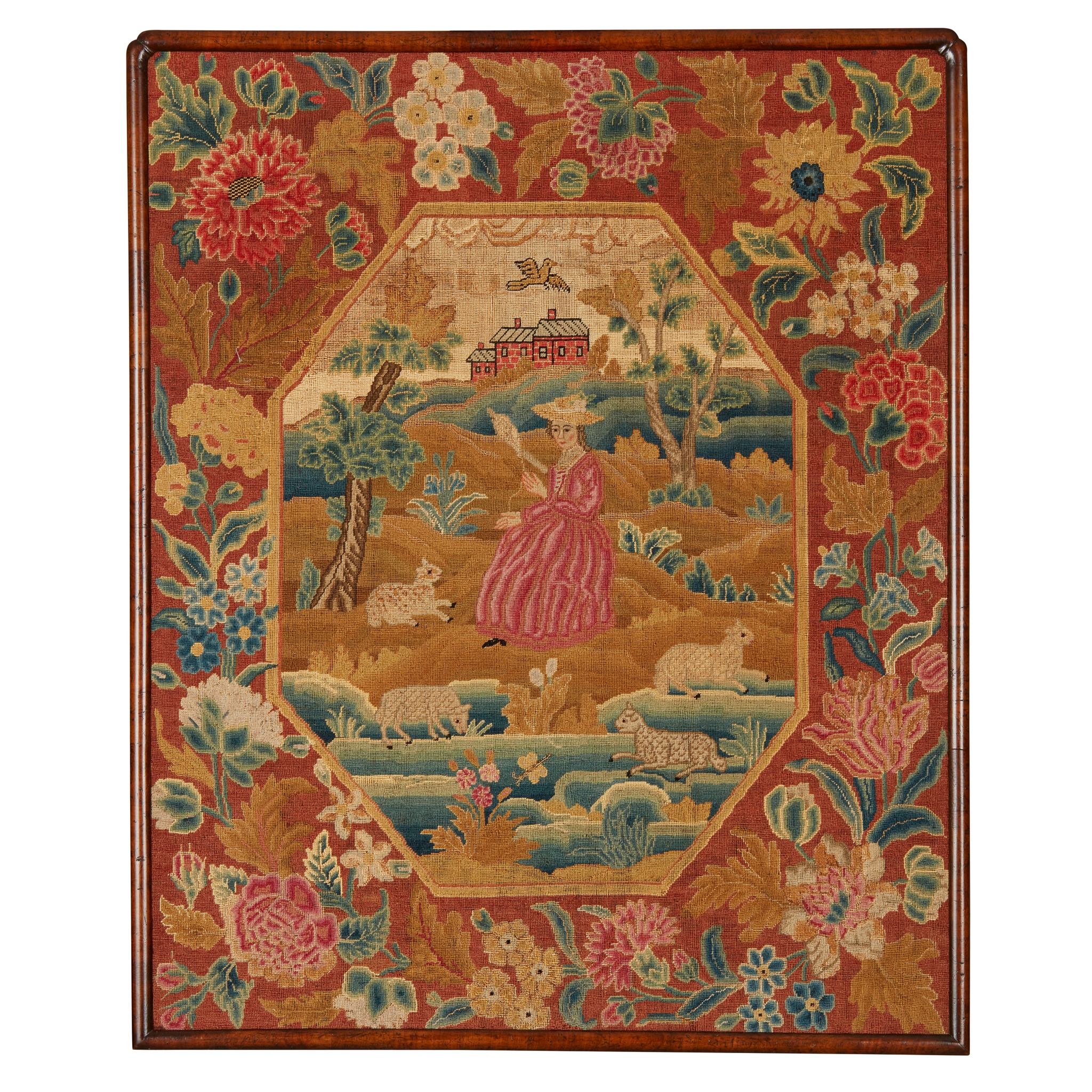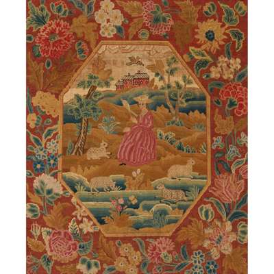 depicting a lady spinning wool in a meadow with sheep, a dove above and a red house in the background, in an octagonal reserve framed by an array of flowers including roses, chrysanthemums, and carnations, framed