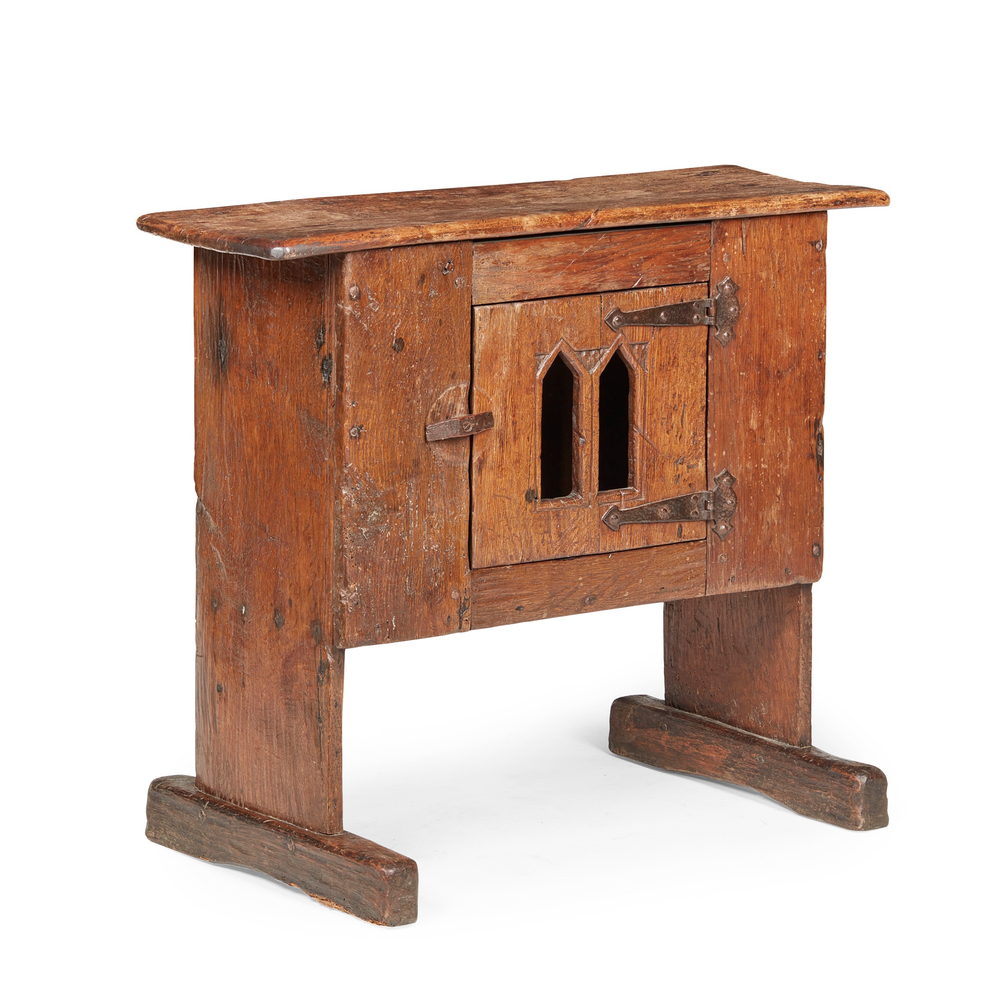 in the 16th century style, the single board top above a door with strap hinges and two pointed arch airing holes, raised on trestle supports