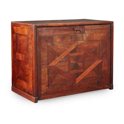 the exterior covered in parquetry with a hinged fall-front opening to reveal three drawers faced in cut steel premiere and contre partie and a baize lined writing surface