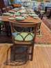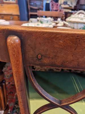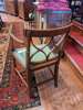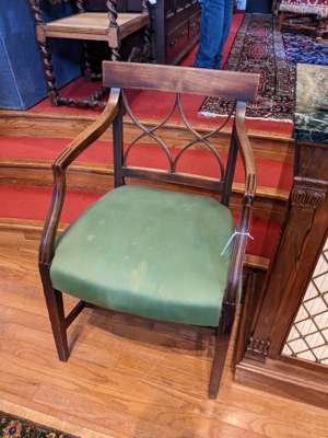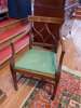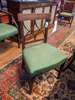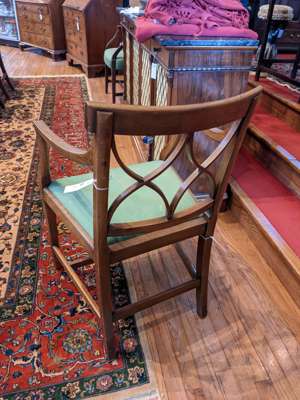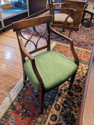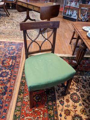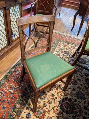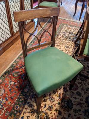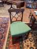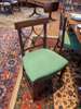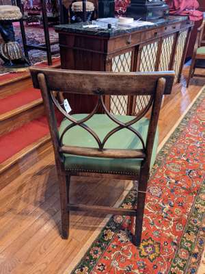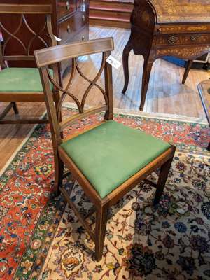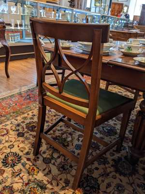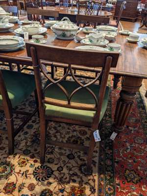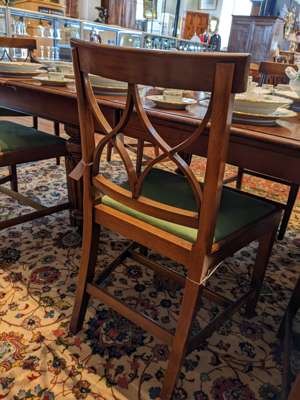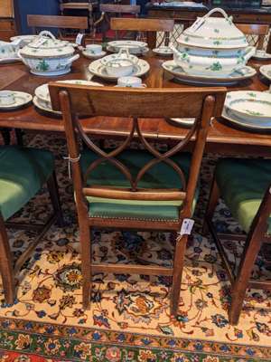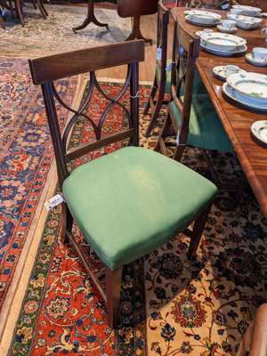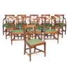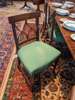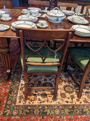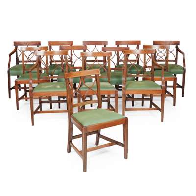 comprising a set of seven period chairs and a set of six similar chairs of a later date, with bar backs above double curved X form back stretchers, on square tapered legs, some with drop-in seats, the other with stuffover seats, all covered in green fabric