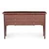 the crossbanded top above a central drawer and arched recess with tambour door, flanked by two drawers and deep drawer, raised on square tapered legs ending in spade feet