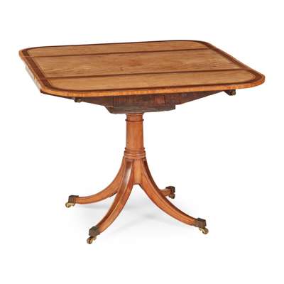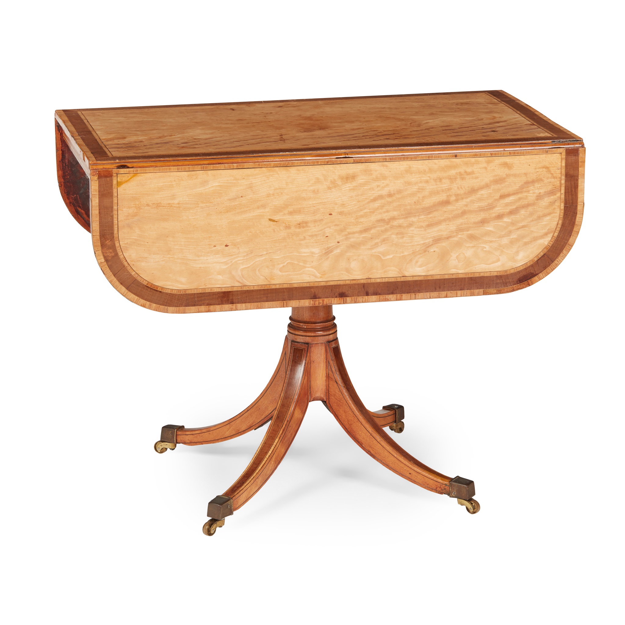 REGENCY SATINWOOD, MAHOGANY AND TULIPWOOD PEDESTAL PEMBROKE TABLE
