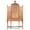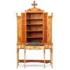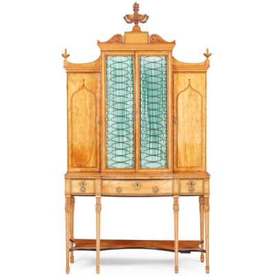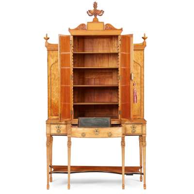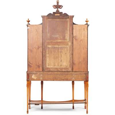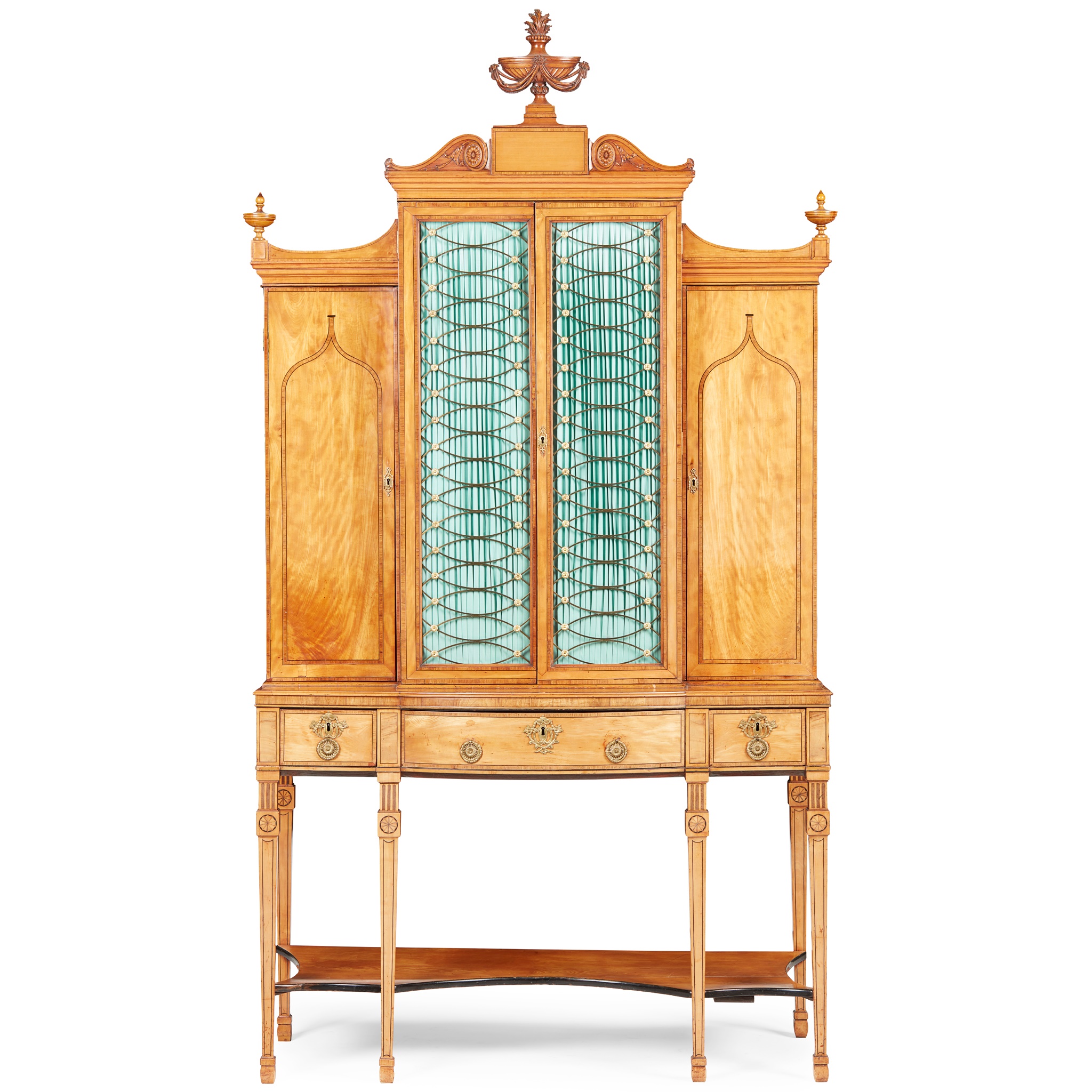 the central cornice surmounted by a flaming urn finial flanked by scrolled brackets, above a pair of brass grille lined doors backed with blue pleated fabric, flanked by side cabinets, all enclosing adjustable shelves; the base with three frieze drawers, the centre drawer fitted with a ratchet adjusted writing slope, raised on square tapered legs inlaid with faux fluting and patera and joined by a shaped undertier, ending in spade feet