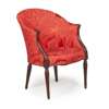 the curved back and stuffover seat covered in red damask outlined in brass stud trim, the arms with moulding facings and raised on fluted tapered legs headed by flower carved corner blocks