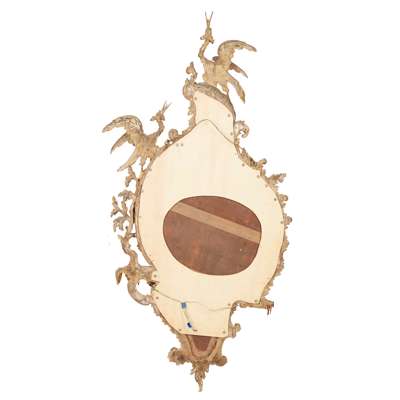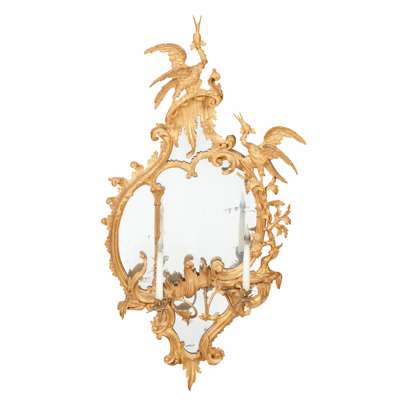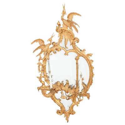 the asymmetrical shaped mirror plates enclosed by frames carved with rocaille, acanthus scrolls, and a pair of ho-ho birds, each frame issuing a pair of acanthus leaf carved candle branches fitted with later metal candle nozzles