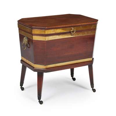 GEORGE III MAHOGANY BRASS BANDED CELLARETTE ON STAND