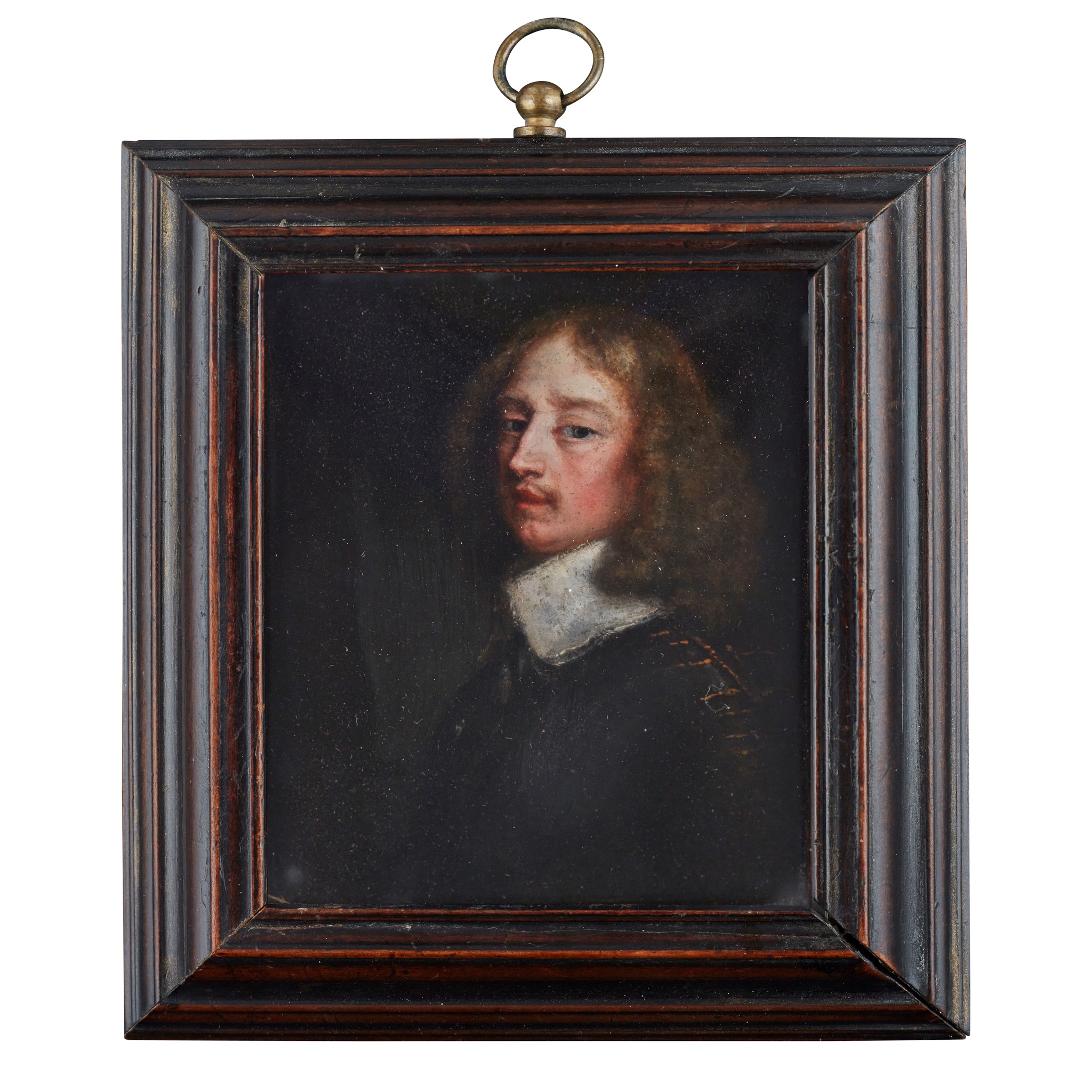 NOTE: This miniature portrait is based on a 17th century three-quarter length portrait of Digby, one version in the collection of Royal Armouries, the other at Sherborne Castle. In that portrait Digby is depicted wearing Franco-Flemish cuirassier armour with his right arm raised holding a baton of command and gesturing towards a battle scene in the background. His left hand rests on his helm and the sash and jewel of the Order of the Garter are clearly visible. At present the artist of the original portrait has not been identified, although there is some research to indicate the 17th century portraitist John Michael Wright as a likely candidate.
