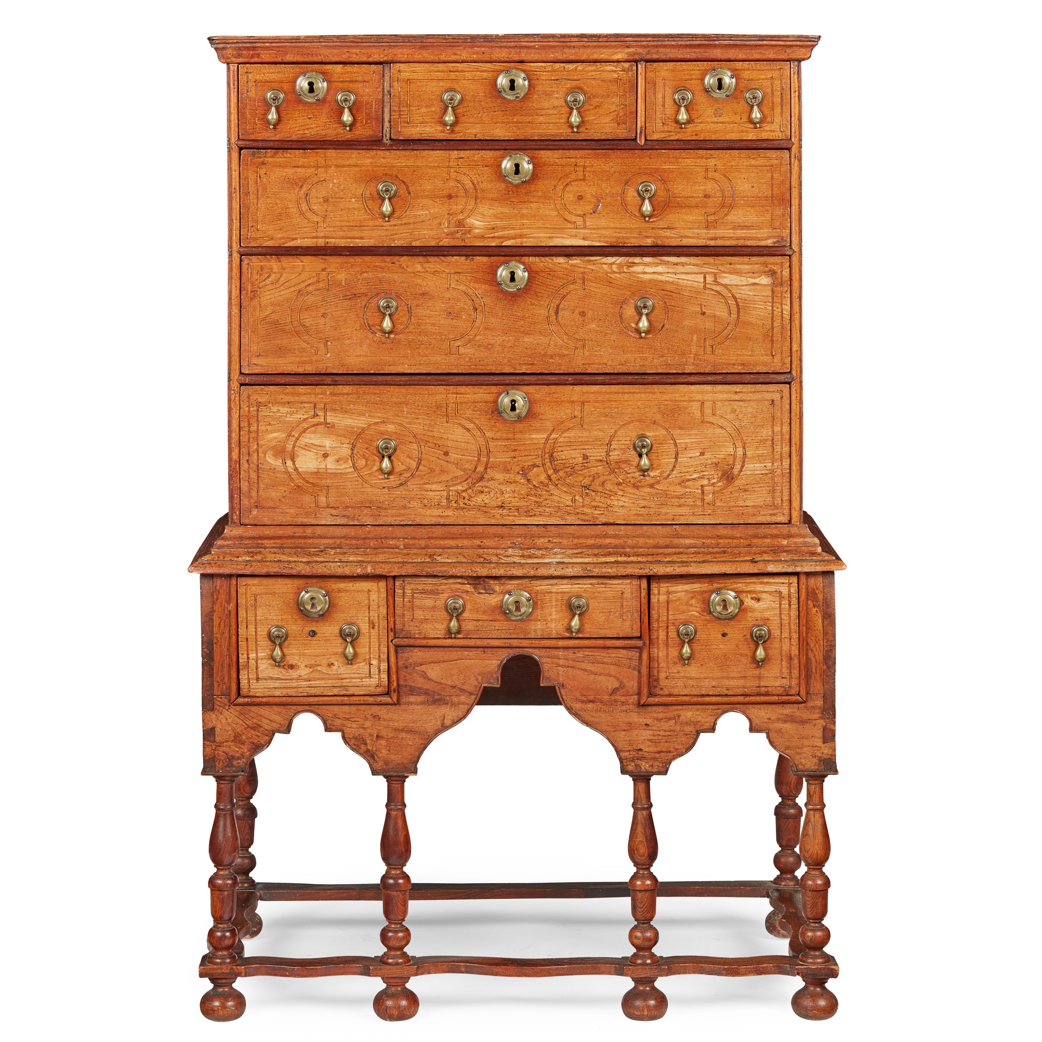 the moulded cornice above three short drawers over three long graduated drawers; the base with three short drawers arranged above a shaped apron, raised on baluster turned legs joined by wavy stretchers on bun feet
