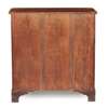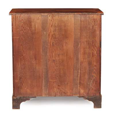 the quarter veneered and crossbanded top with re-entrant corners, above a secretaire drawer fitted with pigeon holes and drawers, above kneehole recess with apron drawer and cupboard, flanked by banks of three drawers, raised on bracket feet