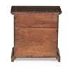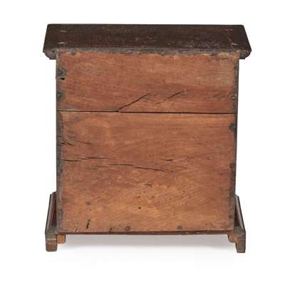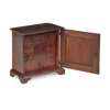 the projecting cornice above a moulded panel door opening to an arrangement of small drawers, raised on bracket feet