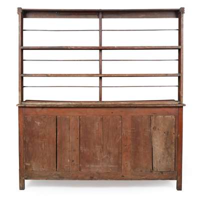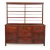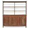 the associated top with a moulded cornice above three open plate shelves; on a base with three short frieze drawers over a pair of graduated centre drawers flanked by panel door cupboards, raised on stile feet