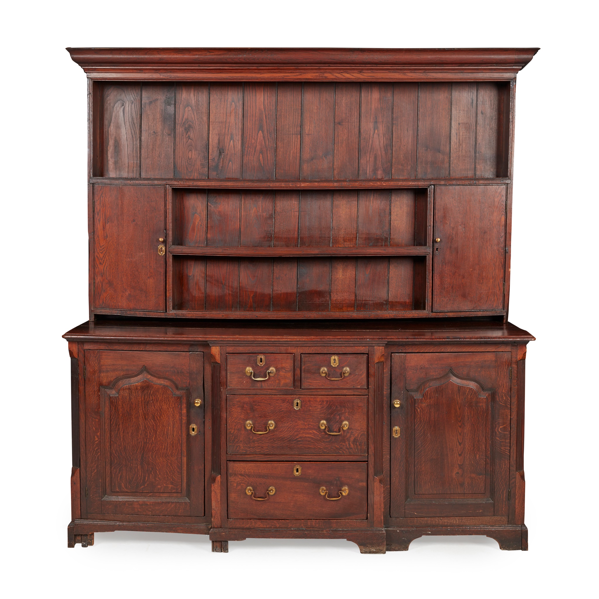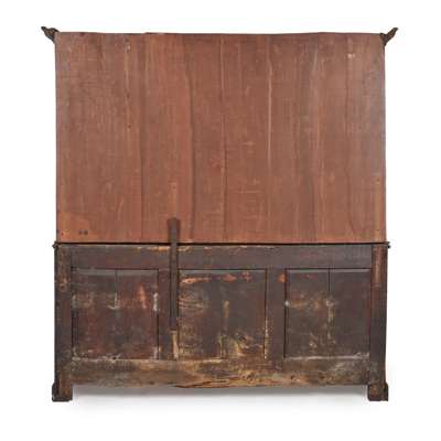 the associated upper part with a moulded cornice above three shelves and cupboards; on a base with two short over two long drawers flanked by moulded panel doors, flanked and divided by fluted angles, raised on bracket feet
