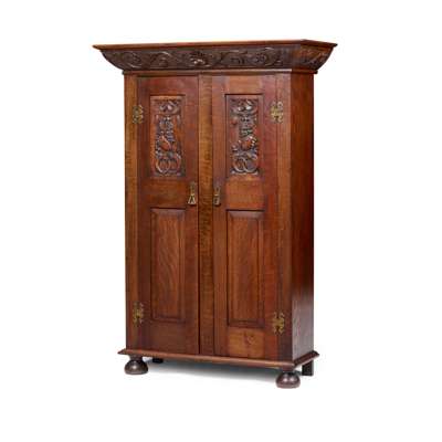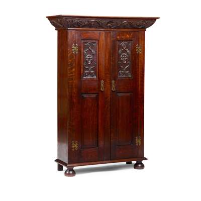 the projecting moulded cornices carved with foliate scrolls and shells, above pairs of panel doors, the upper panels carved with Bacchic and Green Man three-quarter portraits within scrolls and strapwork, opening to shelved interiors, on moulded bases raised on bun feet