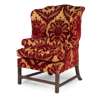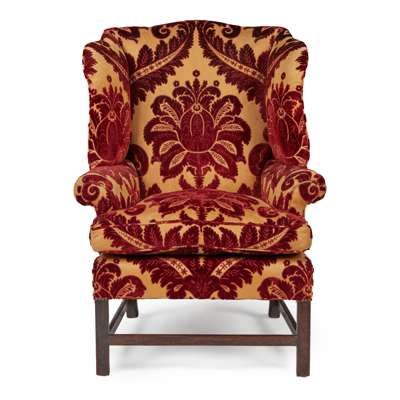 the wide back with a serpentine top rail above a loose cushion seat flanked by scrolled wings and arms, raised on straight legs joined by stretchers; covered in gold and burgundy cut velvet upholstery