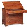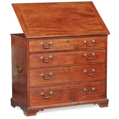 the banded hinged top with ratchet adjustment above a long drawer fitted with a leather writing slope, over three further long graduated drawers, on bracket feet with brass handles to the sides