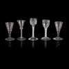 comprising two glasses with ogee bowls and opaque-twist stems, one decorated with fruiting vines, the other with latticework, 14cm and 13cm high; and a pair of small wine glasses, engraved with flowers, on faceted stems, 11.5cm high; together with an UNUSUAL GIN OR WINE GLASS, with a trumpet bowl on a slender opaque-twist stem, 12.5cm high