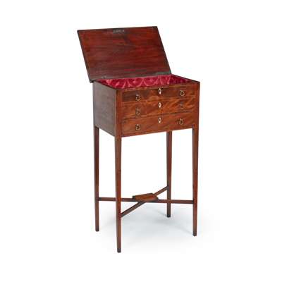 the banding hinged top opening to a fabric lined void interior, the front with two dummy drawers over a base drawer with ivory escutcheons, raised on slender square tapered legs joined by an X stretcher outlined with stringing