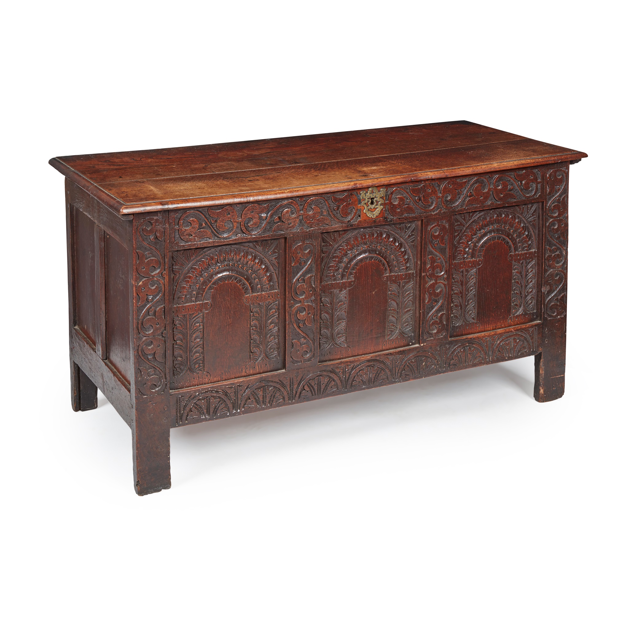 the hinged top opening to a void interior with candlebox, the front with three panels carved with architectural niches within scrolling foliate borders, on stile feet