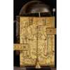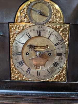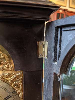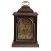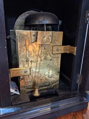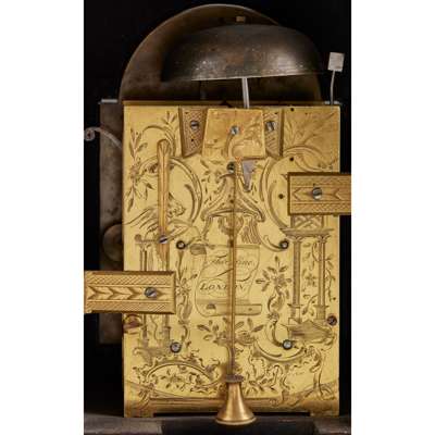 the bell top case with a brass handle above a break-arch dial plate with a silvered chapter ring with Roman and Arabic numerals, enclosing an engraved plaque 'Thomas Hine/ Fleet Street/ LONDON', a date and false pendulum aperture, with a subsidiary STRIKE/SILENT dial to the arch, pierced brass spandrels; the eight-day repeating movement striking a bell, with verge escapement and bob-pendulum, the engraved backplate signed Thos. Hine./ LONDON., on a moulded plinth base