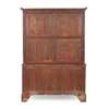the dentil moulded cornice above a pair of moulded doors marks at the corners with carved roundels opening to adjustable shelves; the projecting base with a reeded edge above a slide and pair of moulded panel doors, raised on shaped bracket feet