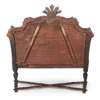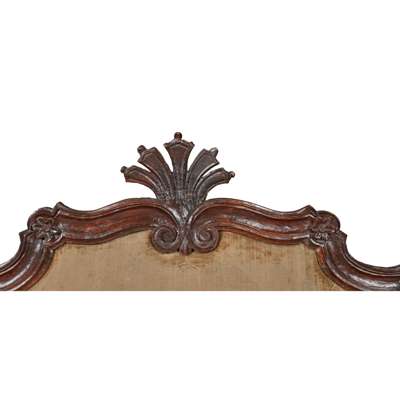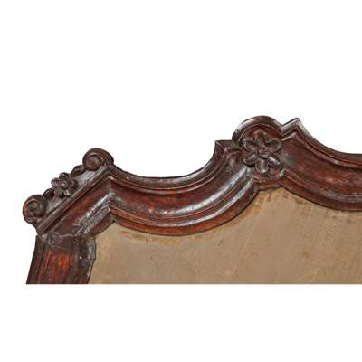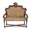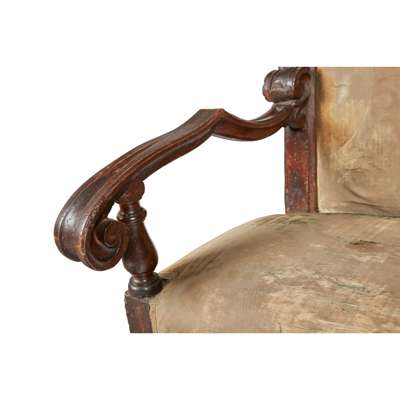 the oak framed padded back in a moulded frame carved with scrolls, flower heads, and centred by a palmette finial, above a stuff-over seat flanked by scrolled arms, raised on turned and tapered legs joined by a wavy X stretcher, covered in worn green velvet