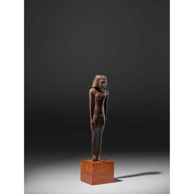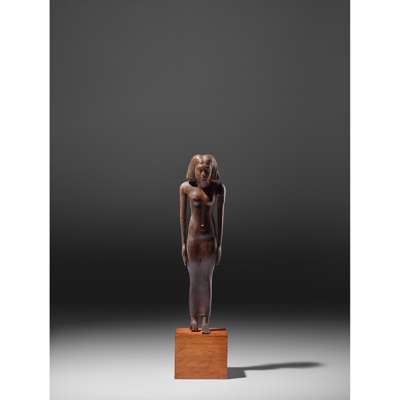 carved wood, shown standing, feet slightly apart, the seperately made arms held to the sides, wearing a tightly fitted sheath dress revealing the form of the body, the wig parted at the forehead and covering the ears and back of the neck, finely carved facial details with subtle smile, raised on a wooden mount