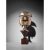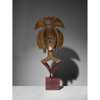 carved wood and hammered copper, of classic abstract form, crescent coiffure leading to bi-planal features and diamond shaped handle, sand polished, mounted on a bespoke wooden stand