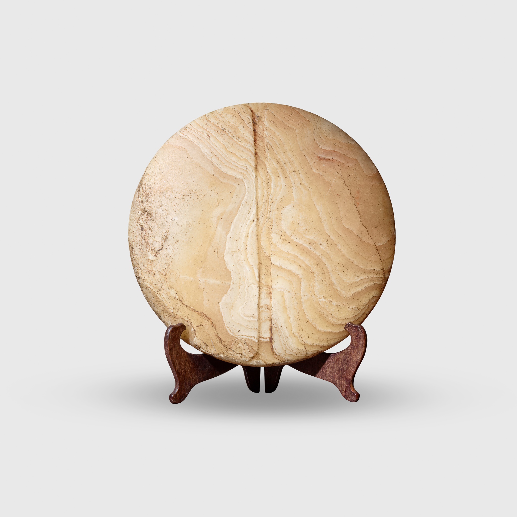 carved and polished alabaster, the banded stone shaped with rounded edges, bisected by a shallow groove