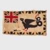 cotton with sewn applique, a mythical bird with curled arrow tail stands above a fallen hunter, Union Jack in top corner