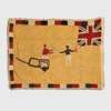 cotton with sewn applique, on a yellow patterned ground, a figure is shown caught in a large trap, confronted by a second man armed with a sword, No 1. company in the bottom corner with a Union Jack above