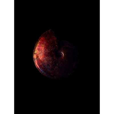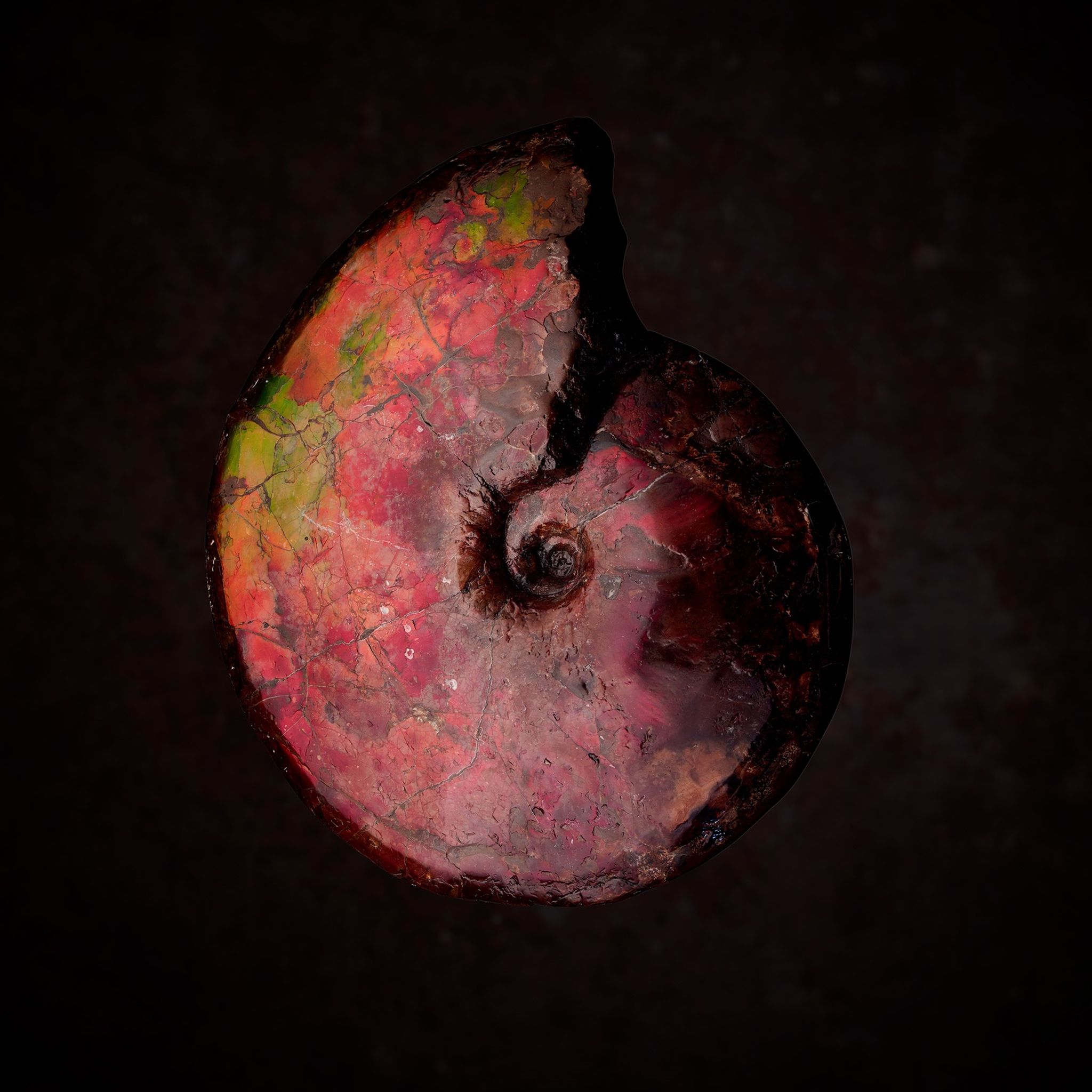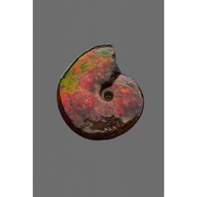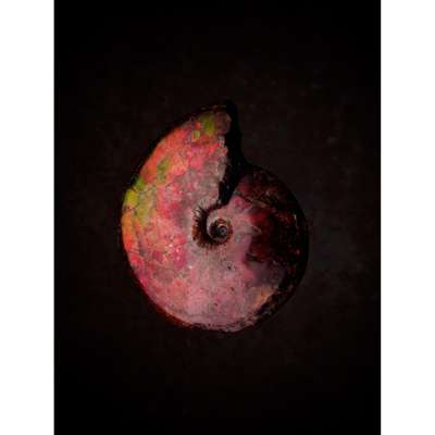 Once a living creature, a large mollusc living in the shallow temperate seas in what is now central Canada, the eons have literally transformed this specimen into a gemstone. Over millions of years, continual compession and the interaction of various minerals have transformed the shell into the opal-like gemstone ammolite. Significant deposits of this substance are only found at the Bearpaw Formation, with the present piece being a particular magnificent example.