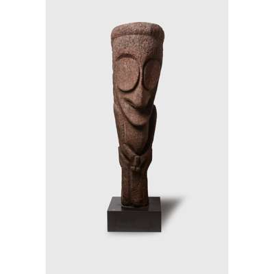carved fernwood, of totemic form with a stylized oversized head carved with prominent eyes and a gaping mouth, the arms held in at the midriff towards the genitals, the knees bent below, raised on a bespoke mount with a label reading "Totem du Pacifique. Big Numbers 65. Solomon Islands [sic]" and a second Gunter Sachs collection label