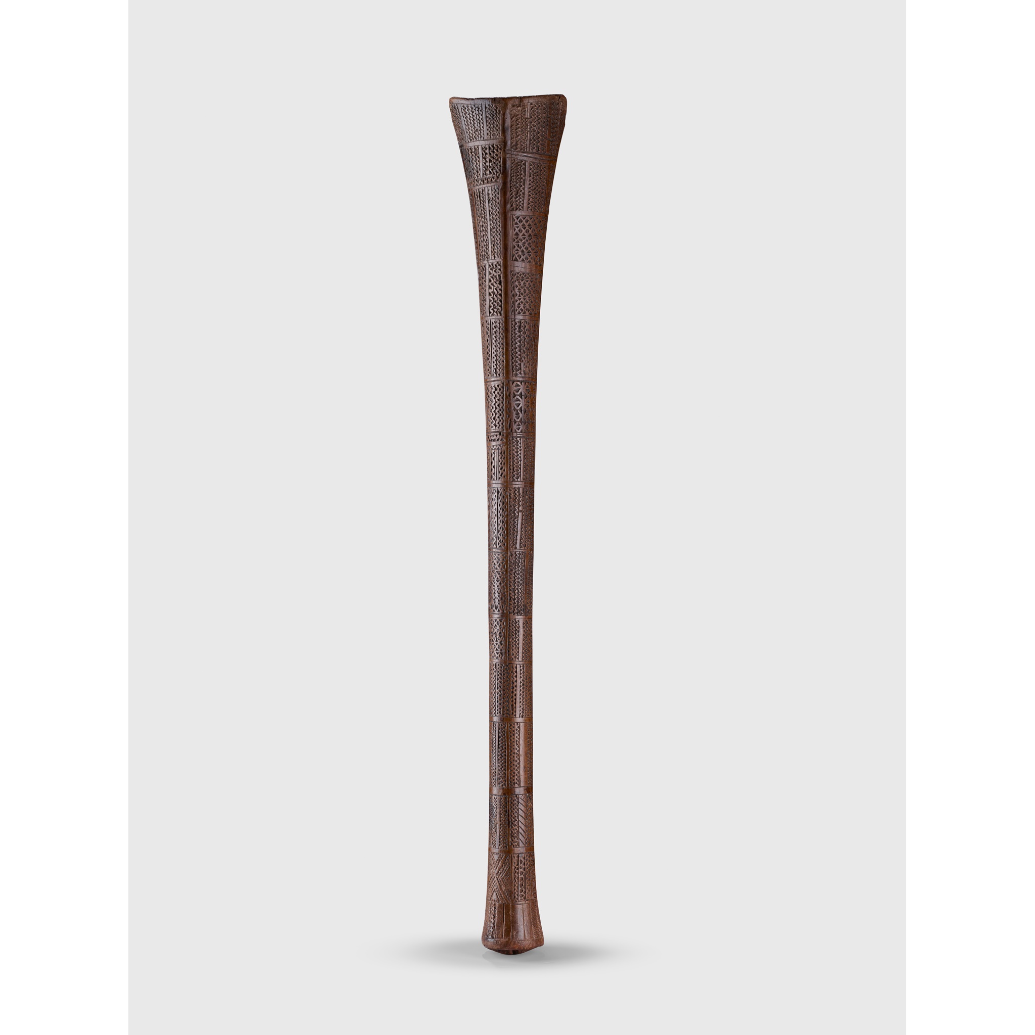 carved wood, rhomboidal in form, surface entirely decorated with carved zig zag motifs and other geometric patterning, subtly rounded base