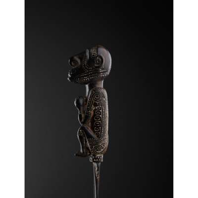 carved wood, seated upon a circular platform above the blade, the handle in the form of a graceful squatting figure, shown with the hands clasped together, knees bent and drawn up into the body, the large head gazing upwards, with prominent nose, ears carved in high relief and carved bands scrolling into the eyes, the body and skull decorated with intricate incised motifs filled with lime, fine glossy patina
