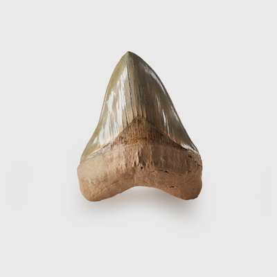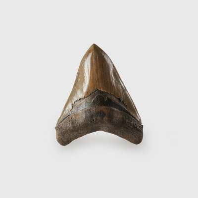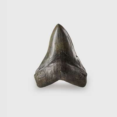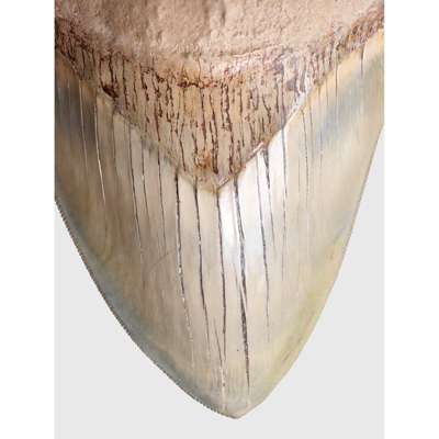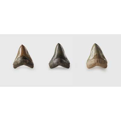 a collection of three Otodus megalodon teeth, all with intact serrations at the base