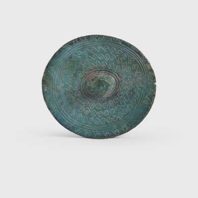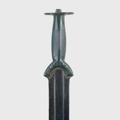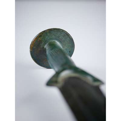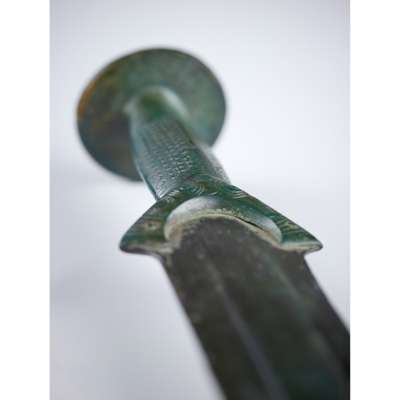 long blade gently broadening below the tip and with medial ridge the hilt with arched guard riveted to the blade and decorated with a series of concentric circles, a concave disc pommel enclosing knob terminal, adorned with elaborate chased linear decoration of waves and dots, rich green patina