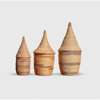 woven grass, of varying sizes, each with lids evoking an architectural form, all with diverse black geometric designs across the body (3)
