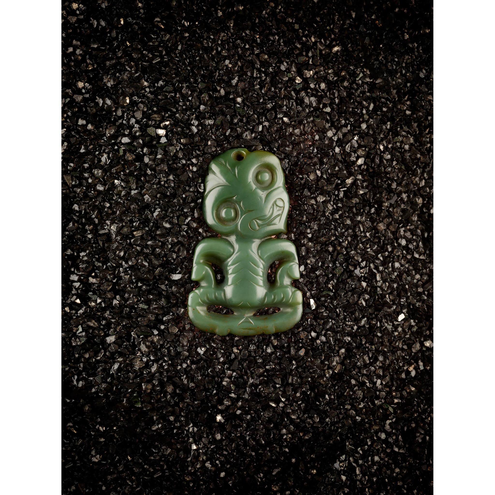 The surface wear and collapsed perforation on the present example suggest extensive use and age. The positioning of the original (now worn through) hole suggests it may have sat as a rounded tab above the head as found in a select number produced on the South Island (Austin:2020 p.129).