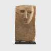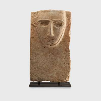 carved limestone, the rectangular stele decorated with a bearded male head in relief, with long slender nose, recessed almond-shaped eyes underneath deep brows and small ears, with remains of an inscription in Sabaean below, raised on a bespoke mount