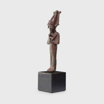 bronze, gold and lapis lazuli, standing deity in typical mummiform pose, holding a crook and flail in his crossed hands, wearing the atef crown with frontal uraeus and incised plaited false beard, the face with inlaid quartz eyes and lapis brows, raised on a bespoke mount