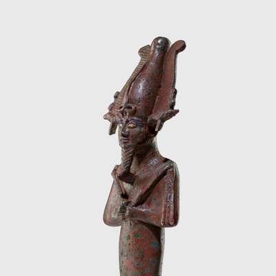 Osiris is most often represented as a shrouded mummy, emphasizing his connection with the dead. He holds a flail and a short shepherd’s crook, insignia associated with Egyptian kingship, and wears a long, braided beard, emblematic of divinity. On the front of his tall crown is a uraeus, a cobra ready to spit fire at his enemies. The horns may link him with the sun god, who often appears as a ram-headed man at the end of the day and during the night.
