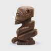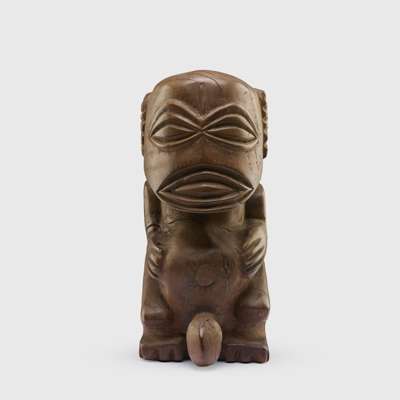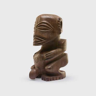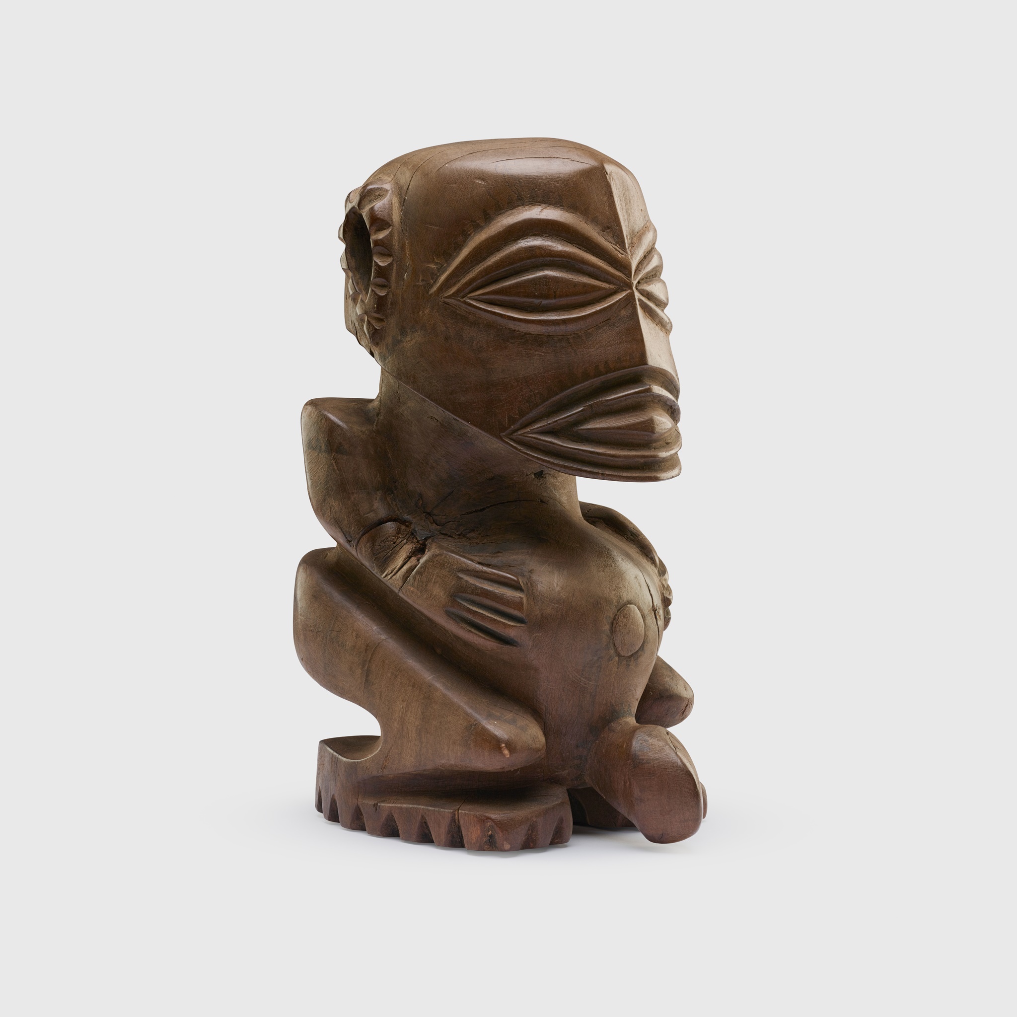 carved wood, shown crouched, with elongated torso and phallus, the arms clutching the midriff, with faint tattooing around the eyes, mouth, navel, arms phallus and knees.