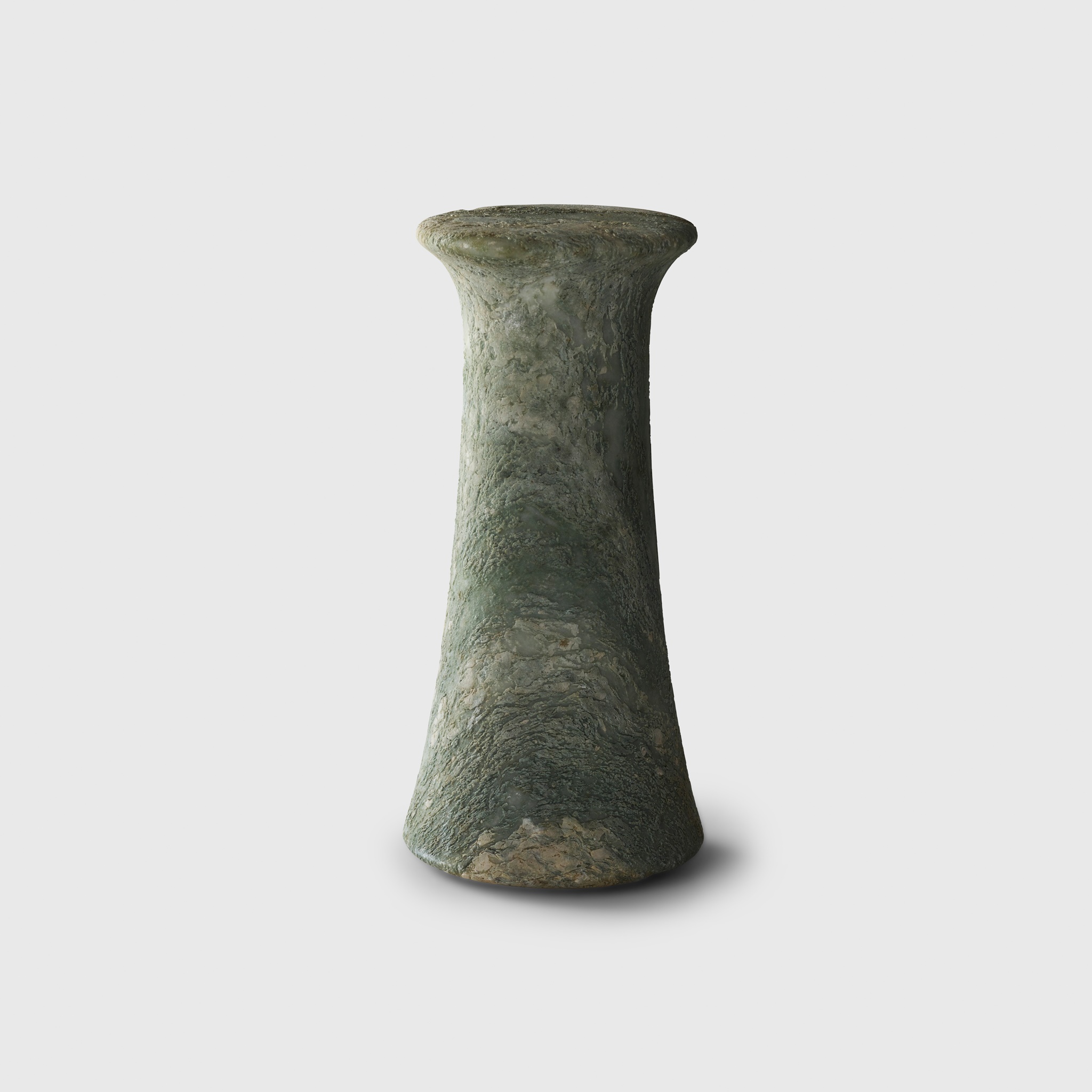 carved green marble, standing on a flat base with central groove, elegant cylindrical form, waisted body with a shallow groove at the top, the mottled green surface evoking swirling clouds