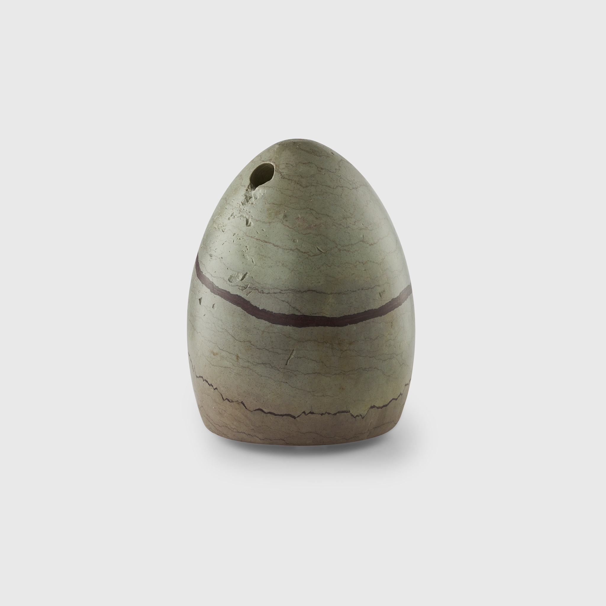 carved and polished stone, standing on a flat base, of ovoid form, with dual perforations for suspension at the top, the colour a vibrant green and grey with alternating horizontal veins