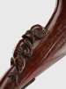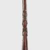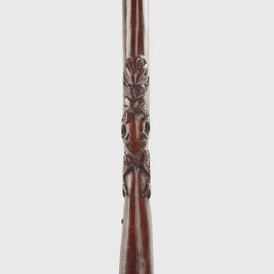 carved wood, the grip terminating in a tiki face, the flat, elegantly curved blade with a central reclining openwork tiki figure