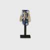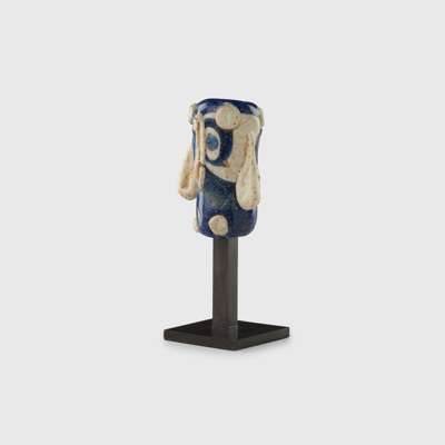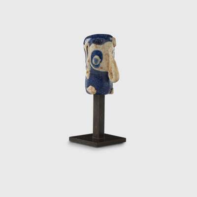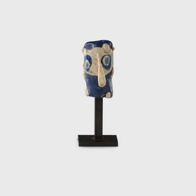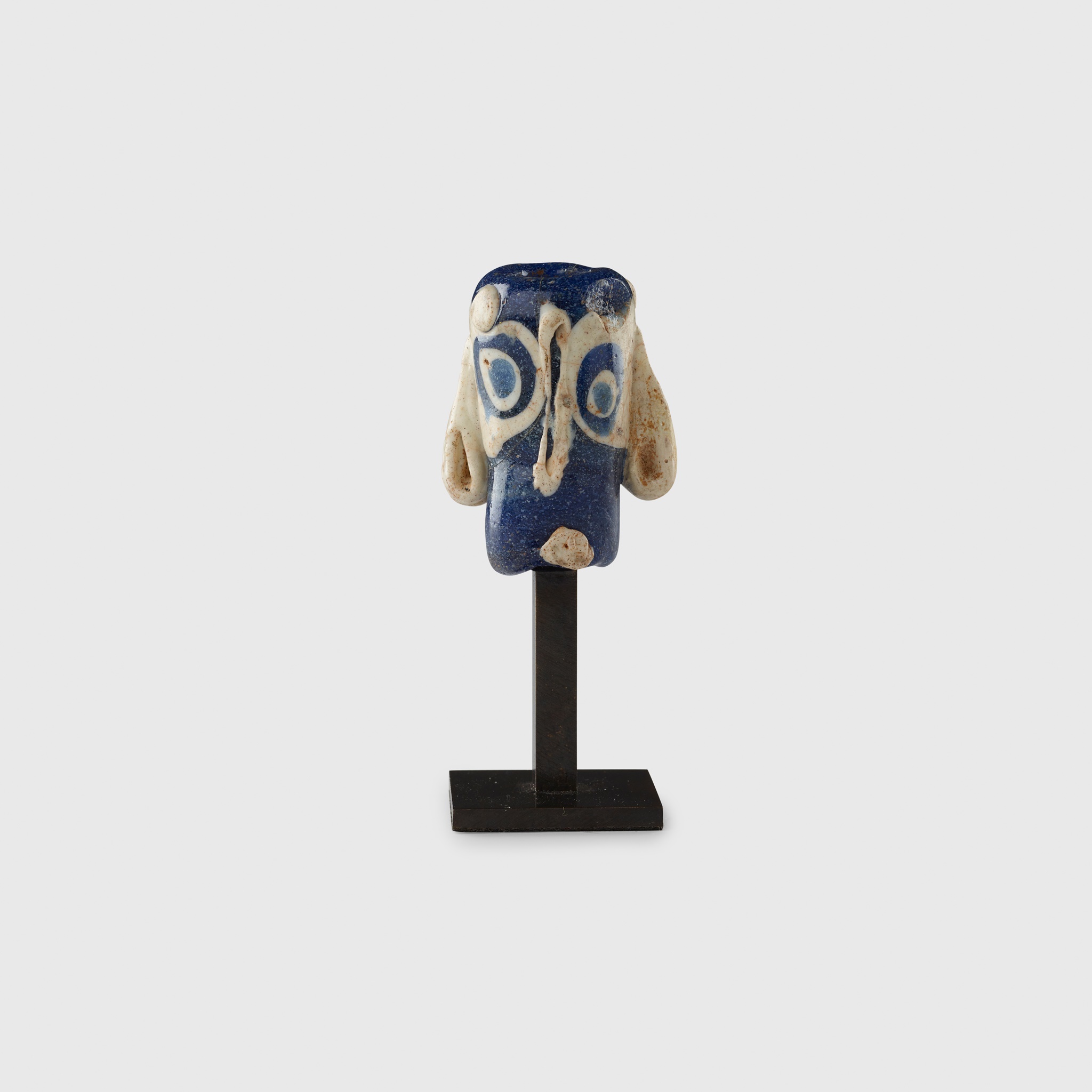 glass, formed of a cylindrical dark blue bead with applied white detail on both sides marking the facial features, raised on a bespoke mount