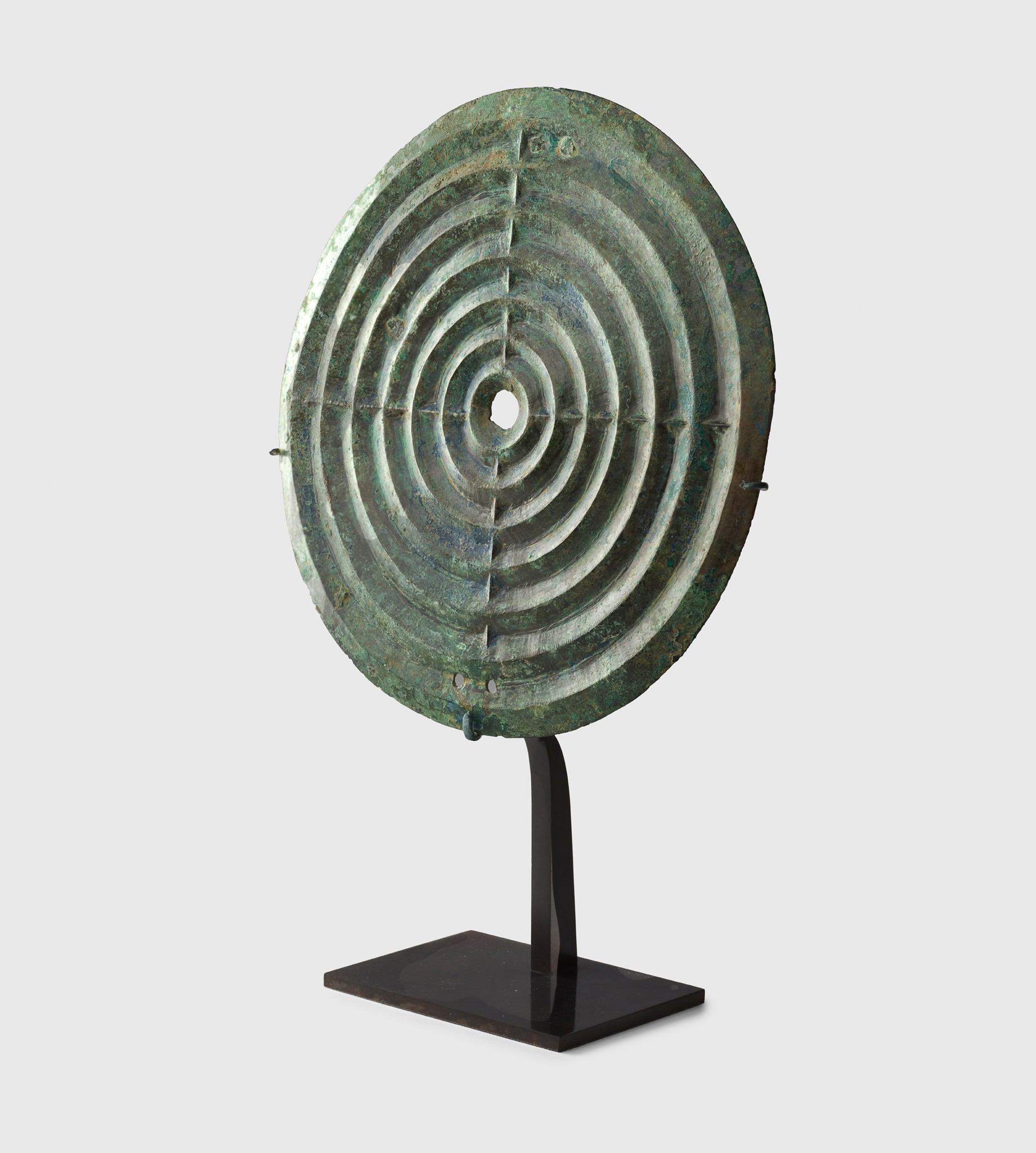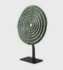hammered bronze, of circular form with a series of concentric ridges leading to a central perforation, raised on a bespoke mount