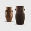 carved wood, the first with dark patination and the lower two thirds entirely covered in amasumpa; the second with dual lug handles and a small shallow panel of amasumpa, caramel patination (2)